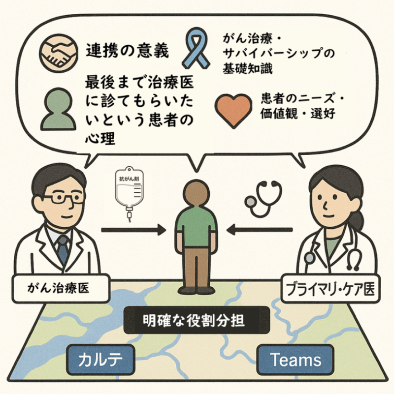 討論では、プライマリ・ケア医とがん治療医とが連携するうえで共有するべき情報として、