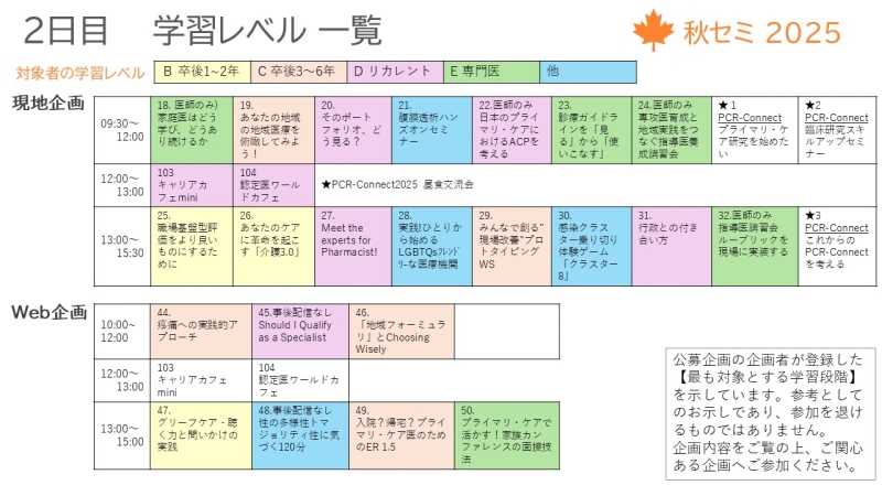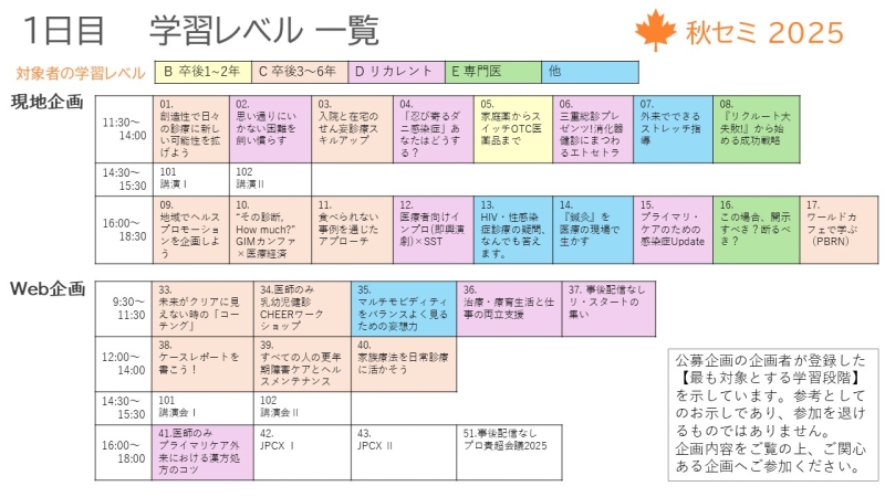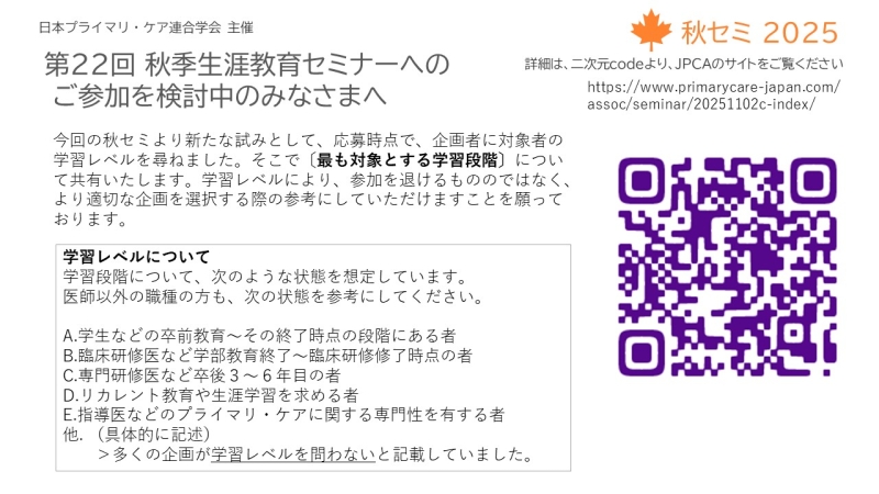今回の秋季生涯教育セミナーでは、プライマリ・ケア教育委員会のご協力で、企画者が意識した「主な対象学習レベル」を可視化した資料を公開いたしました