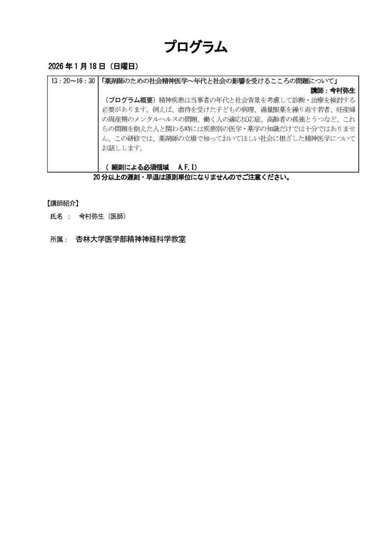 精神疾患は当事者の年代と社会背景を考慮して診断・治療を検討する必要があります。例えば、虐待を受けた子どもの病理、過量服薬を繰り返す若者、妊産婦の周産期のメンタルヘルスの問題、働く人の適応反応症、高齢者の孤独とうつなど、これらの問題を抱えた人と関わる時には疾患別の医学・薬学の知識だけでは十分ではありません。この研修では、薬剤師の立場で知っておいてほしい社会に根ざした精神医学についてお話しします。