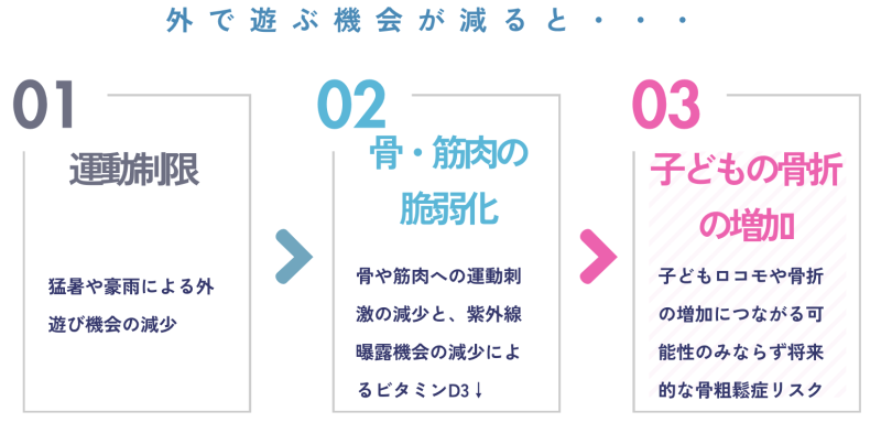 地球温暖化は、私たちの生活の様々な側面に影響を及ぼしています。特に、近年増加する猛暑日は、子どもたちの健康、とりわけ骨の健康に、間接的ではあるものの深刻な影響を与える可能性が懸念されています。