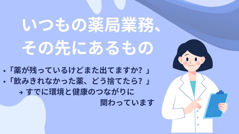 薬剤師や薬局業務と聞くと、直接的に地球規模の環境問題と結びつきにくいかもしれません。しかし、日々の業務の中には、すでに環境と健康のつながりを示すサインが隠れています 。