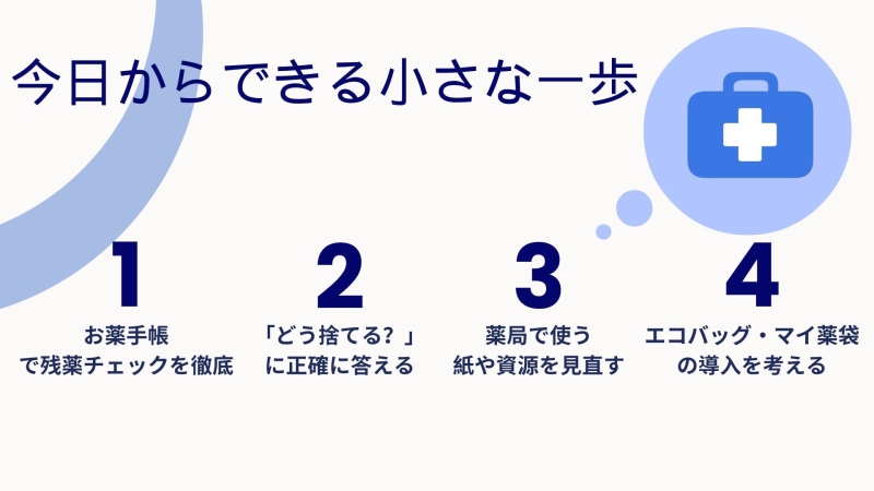 日常の薬局業務の中で、今日からできる「小さな一歩」となる具体的な行動を 4 つ紹介します 。