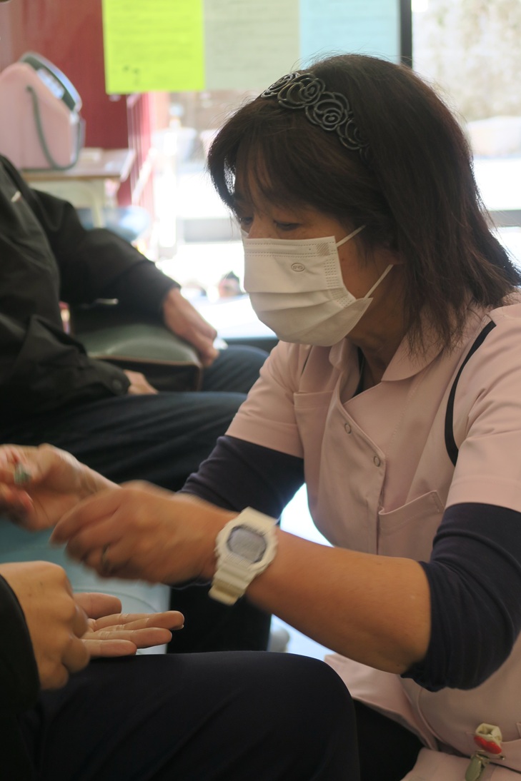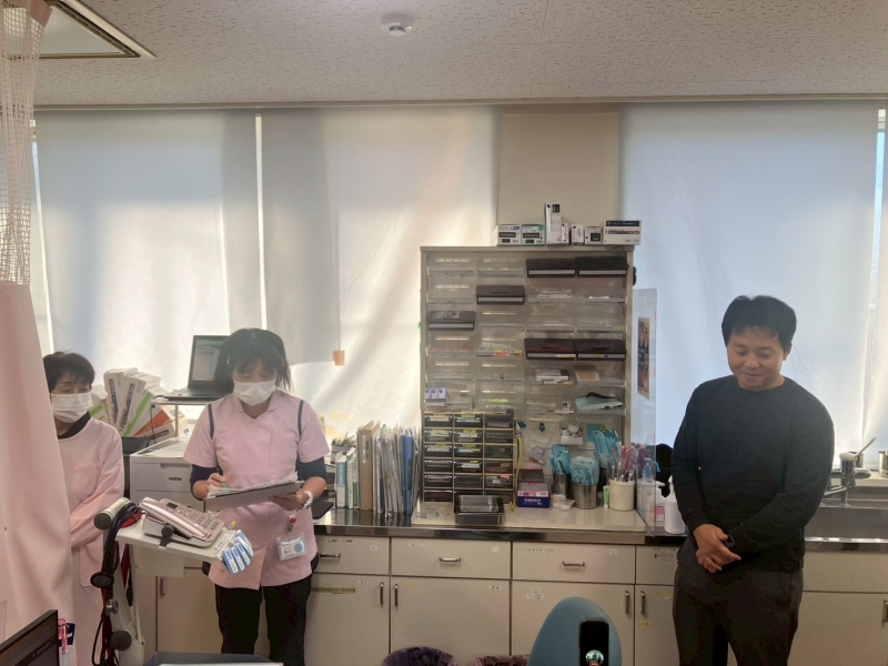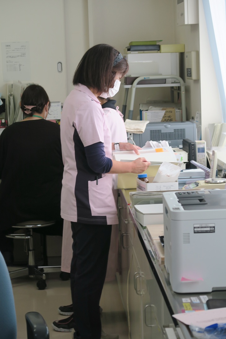 訪問2日目の木曜日は診療日なので朝から準備が始まります。近隣の市立診療所からの応援の看護師1名、非常勤で処方薬調剤担当のベテラン看護師1名、事務担当の1名、そして森川看護師、本郷診療所 所長である西村謙祐先生の総勢5名が担当します。全員が診察室に集まり朝礼が始まり、連絡事項の確認後にただちに仕事開始かと思いきや、森川さんによる「エイエイオー」のかけ声と共に全員で拳を挙げてからの診療開始でした。毎回様々な気合い入れる方法を模索しているそうです。