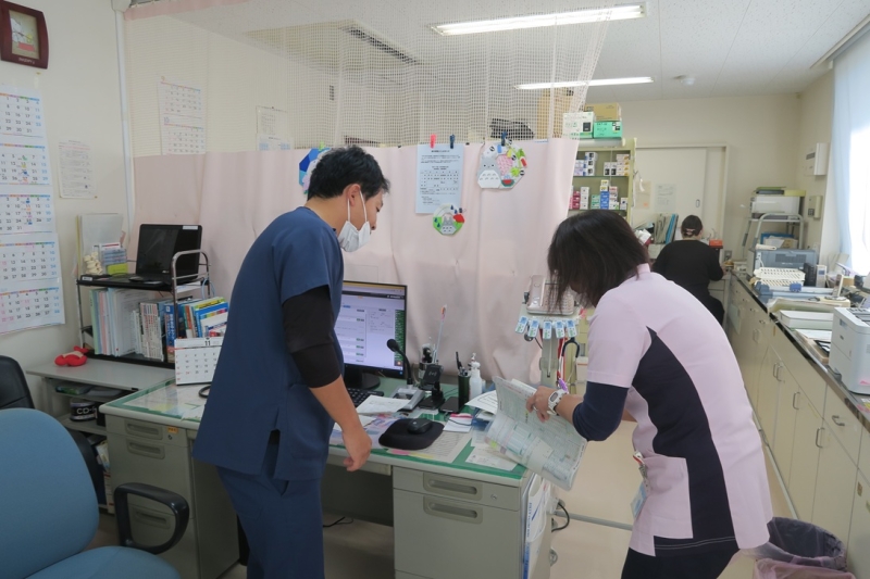 診察・処方・事務・検査をテキパキと行っている傍らには、注意点がびっしりと書き込まれたメモ帳がありました。看護業務に加えてこのようにマルチタスクが求められているのが、医療者の少ないへき地の医療機関の特徴であると言えます。患者さんに伺うと診療所に対する信頼と共に、健康にかかわらずどのような話題でも相談に乗っていただける森川看護師の存在は心強いそうです。森川看護師に伺うと、患者さんの病気のことに加えて、パーソナルヒストリーや家族の状況、さらにはご夫婦のなれそめまでご存じでした。このように疾患のみならず患者さんを取り囲む環境などの情報を持つことができるのが地域在住の看護師ならでの醍醐味だそうです。