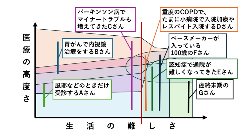 また、このような時期になると、もともとの基礎疾患の他に感染症や便秘、転倒、皮膚トラブルなど様々な問題が起こりやすくなります。さらにそれらを患者自身で解決する能力が低下しているために、医療機関への依存度は高くなります。一方で、よく起きる健康問題は基幹病院の専門医が診なくても対応できることが多いです。