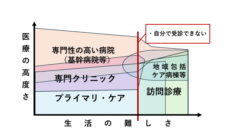 そして、ある一定のラインで自分では受診ができなくなり、それと合わせて急激に専門性の高い病院での加療が難しくなります。ただし、難病などで高度な医療がどうしても必要な患者には数か月に1回と受診頻度を落としてでも専門性の高い病院にかかり続けないといけないでしょう。その後、さらに生活の難しさが増していくと、プライマリ・ケアの外来に受診することも難しくなり、訪問診療が必要となっていきます。