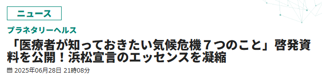今年度北海道で行われた学術大会では、浜松宣言の内容をコンパクトにまとめた啓発資料「医療者が知っておきたい気候危機7つのこと」を作成しました。