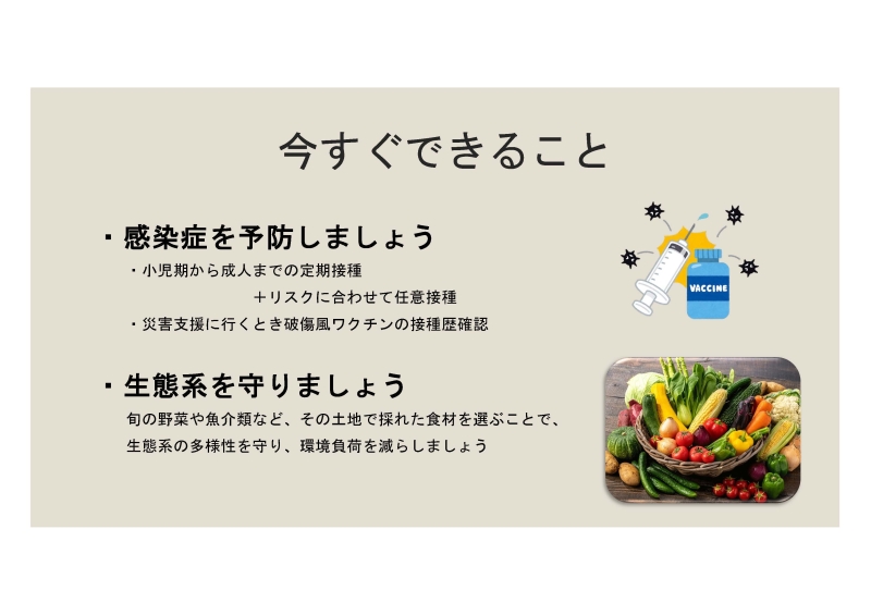 今すぐできることは感染症予防の基本と予防接種です。小児期から成人までの定期接種に加え、個々のリスクに応じた任意接種、災害支援に行く際の破傷風ワクチン接種歴の確認など。また、旬の野菜や魚介類など、その土地で採れた食材を選ぶことを通じて、生態系の多様性を守り、環境負荷を減らすという視点も大切です。