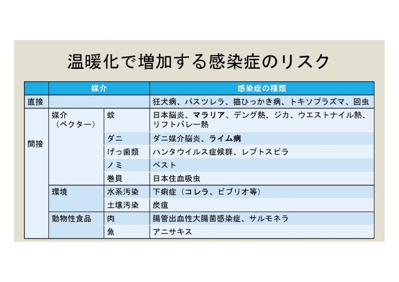 蚊が媒介する日本脳炎、マラリア、デング熱、ジカ熱、ウエストナイル熱、リフトバレー熱、ダニが媒介するダニ媒介脳炎、ライム病、げっ歯類に関連するハンタウイルス症候群、レプトスピラ症など。さらに、動物からの直接感染に加え、水系汚染による下痢症(コレラ、ビブリオ等)、土壌汚染による炭疽、肉や魚を介する感染症など、環境変化に伴ってリスクが高まりうる感染症があります。