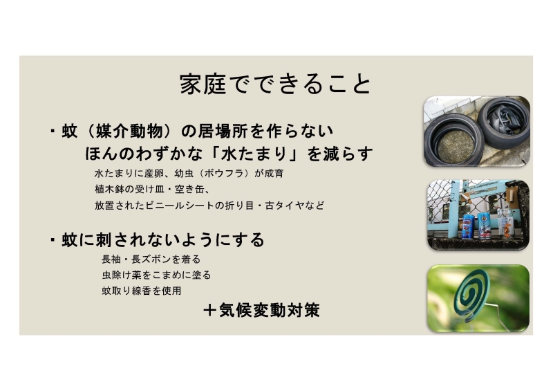 さらに、長袖・長ズボンの着用、虫よけ薬の使用、蚊取り線香の活用など、蚊などのベクターに刺されないための基本的な予防策も大事です。